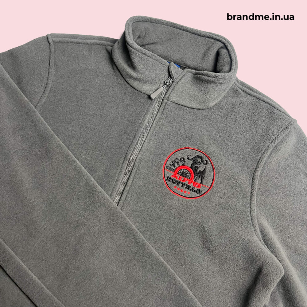 Вишивка логотипу – найкращий метод нанесення на фліски. Вишивка на жилетках та кофтах виглядає презентабельно, фактурно та дозволяє передати усі кольори логотипу.